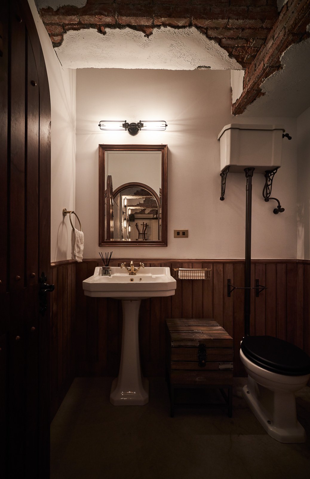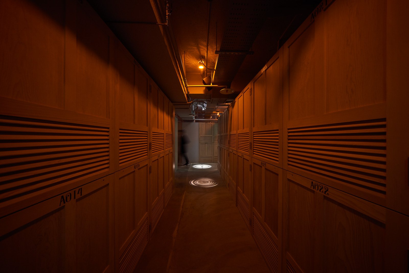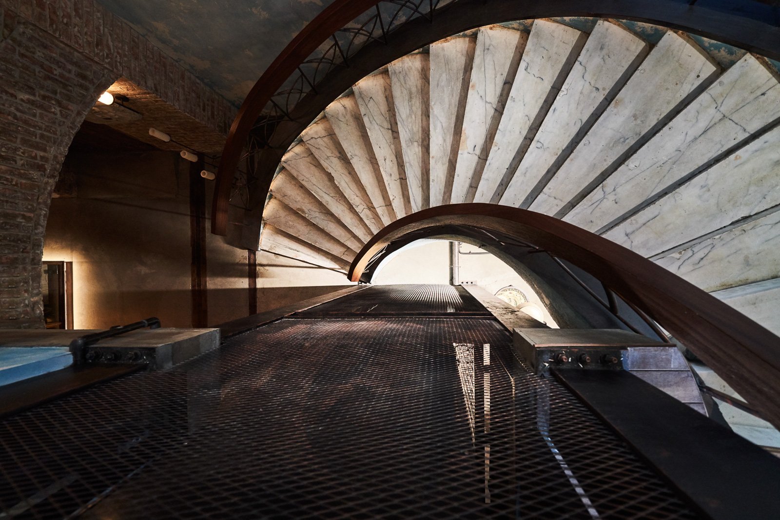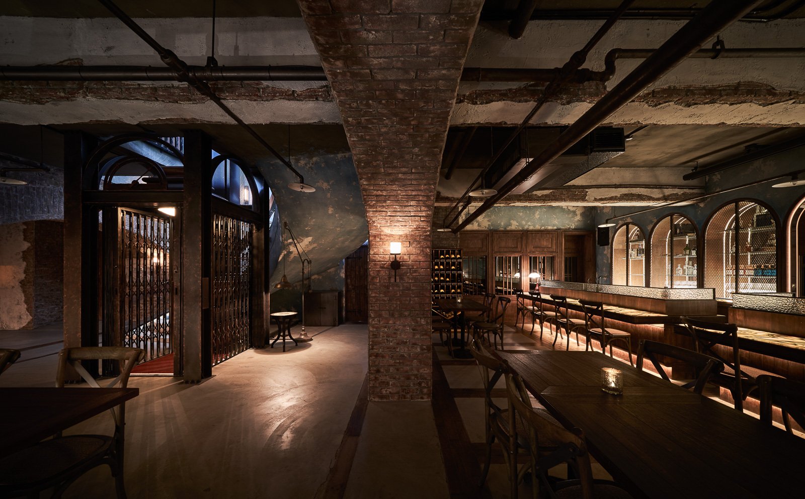 門沒有鎖頭。不是因為不需要安全,而是因為鎖頭會破壞整件事的氛圍。在你走進藏酒廊道之前,你會在紅磚牆上的獅頭石雕前停下來,打開手機裡的 APP,把 QR Code 對著它。木門開啟。你踏進去,廊道的燈跟著你的位置亮起,照亮你腳下那一格,其他地方保持暗。取完酒,離開,燈滅,門關。進入一個認真的地方,應該有一個認真的動作。儀式感不是表演,是品牌氛圍的入口。門關上之後,是另一個時間維度。斑剝的牆面、紅磚拱頂、粗礪的地面,在微光裡呈現的不是殘破,而是時間的密度。木作酒架、鑄鐵壁燈、錘紋金屬吧台面——每一個材質都在說同一件事:這裡對待事物的方式,和外面不一樣。