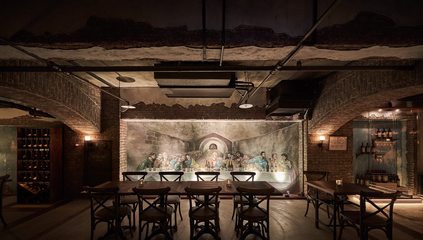 這兩件事的差距,就是那兩根柱子。現代建築的跨距早已解決了承重問題,中間不需要柱子。但中古世紀的地下室不會有這種跨距。沒有柱子,空間就會說謊。所以我們把它們放回去,不是為了裝飾,而是為了讓整件事保持誠實。牆上那幅壁畫借的是《最後的晚餐》的構圖骨架。坐在正中央的是勃根地之神,祂的信徒圍繞左右,桌上不是麵包,是一排勃根地。壁畫師用那個時代的筆觸作畫,透視點技法讓地下空間在視覺上向後無限延伸。品牌的信仰體系,被畫進了牆裡。