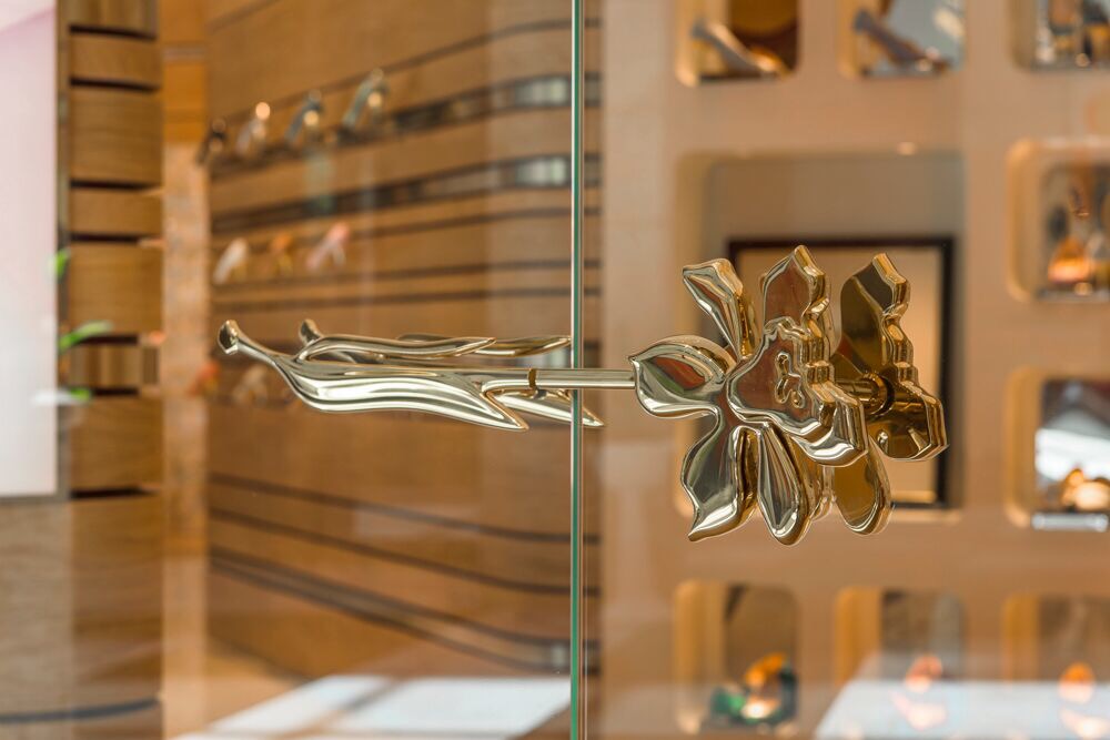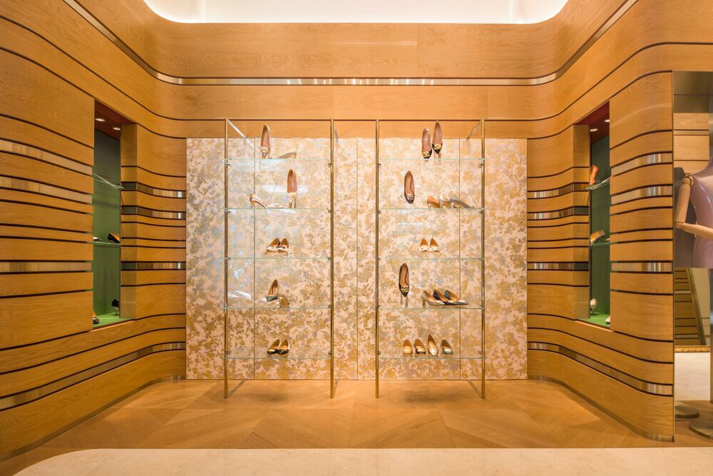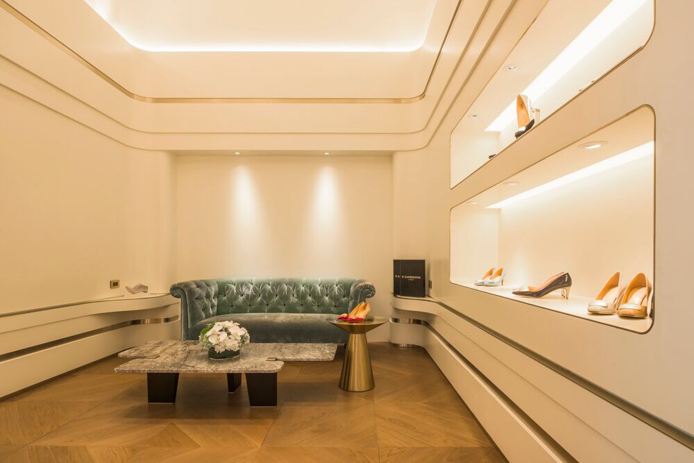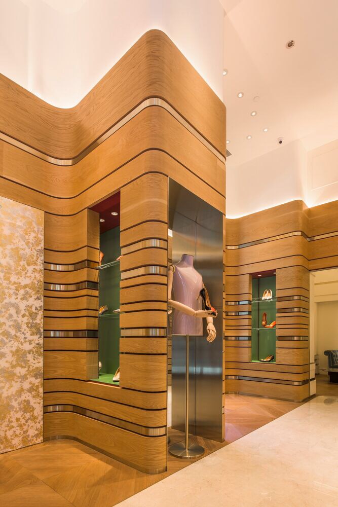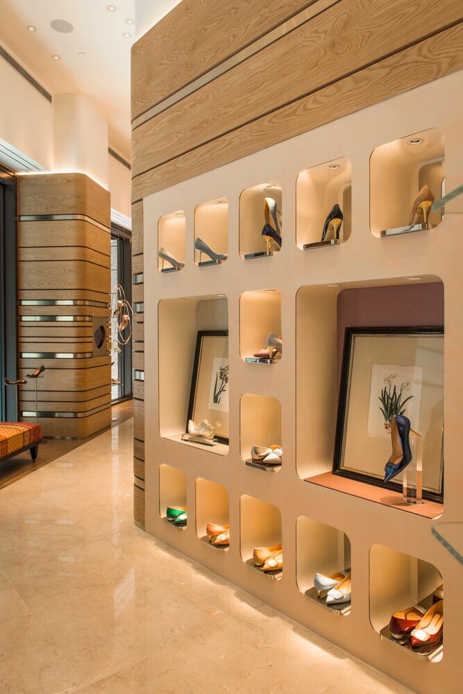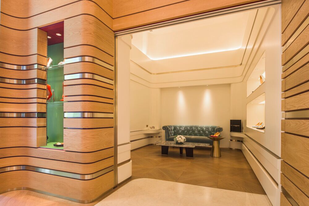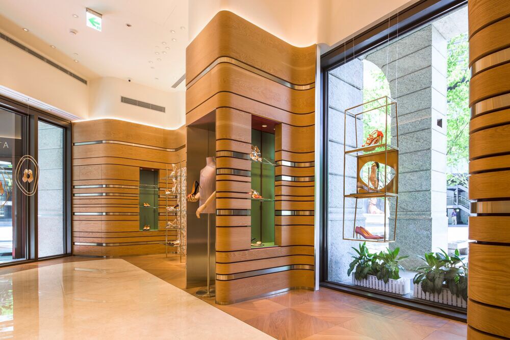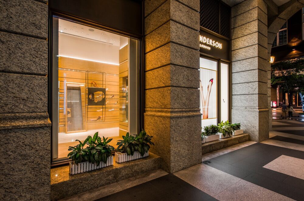 R. Sanderson 的入口刻意內縮。你不是走進一個空間,你是被引導進去的。這個縮口不是美學決定,是一個讓身體先於眼睛進場的策略——當你的腳先移動,你的注意力才會跟上。動線末端是 VIP 試穿區,曲面牆圍塑,尺度稍稍放大,讓人在不自覺間放慢、坐下、停留。路徑,才是零售設計真正的產品。